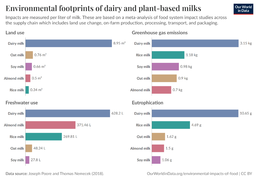 Source: Dairy vs. plant-based milk: what are the environmental impacts? – Our World in Data